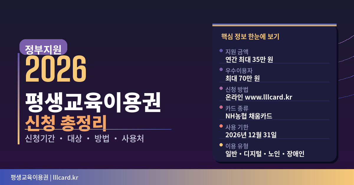 2026년 평생교육이용권은 단순한 수강료 지원을 넘어, 배우고 싶지만 비용 때문에 망설였던 분들에게 실질적인 기회를 드리는 제도입니다. 연간 35만 원이라는 금액이 작아 보일 수도 있지만, 외국어 기초 강좌나 컴퓨터·디지털 강좌 수강에 충분히 활용할 수 있는 금액입니다. 자격 요건만 맞는다면 반드시 신청해 보시기 바랍니다. 1차 모집 기간이 이미 진행 중인 지역도 있으니, 오늘 바로 www.lllcard.kr에 접속하셔서 내 지역 공고를 확인해 보세요.