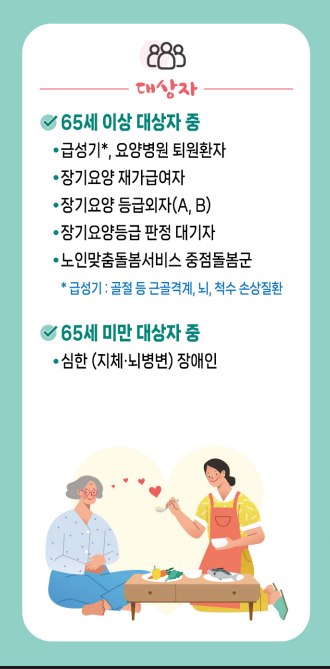 | 퇴원 환자 | 수술이나 입원 치료 후 퇴원했으나 가정에서 집중 재가 의료·돌봄 서비스가 필요한 분 |