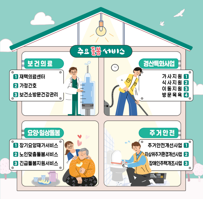 | 일상생활 돌봄 | 가사 지원, 식사 지원, 이동 지원, 주거 안전 개선, 긴급돌봄 |