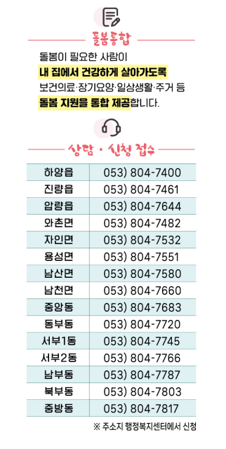 | 경산시청 복지 담당부서 | 경산시청 대표번호(☎ 053-810-6000) 통해 통합지원 담당 부서 연결 |