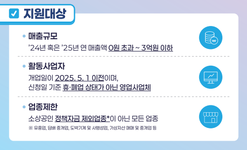 - 매출 기준: 연 매출 0원 초과 ~ 3억 원 이하의 소상공인.