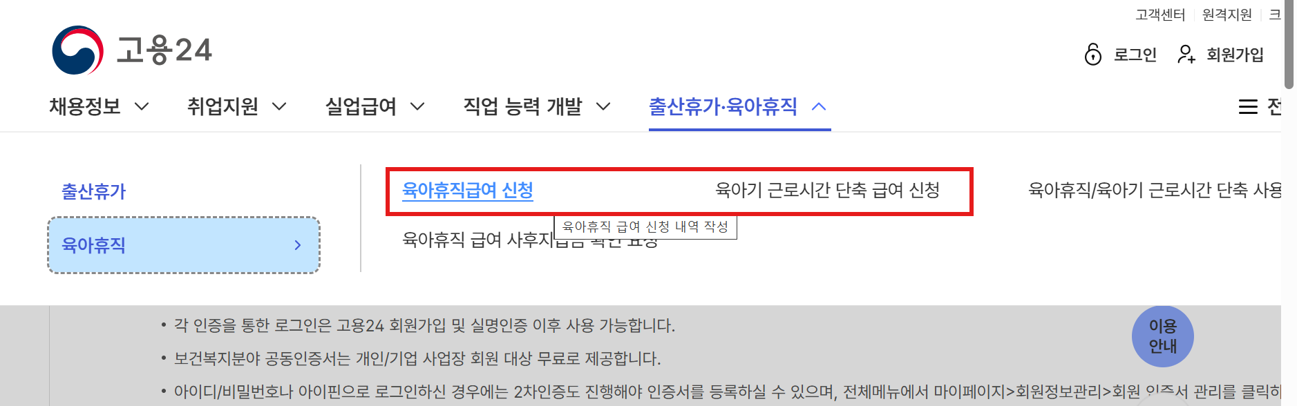 - 고용보* 홈페이지 접속 → 육아휴직 급여 신청