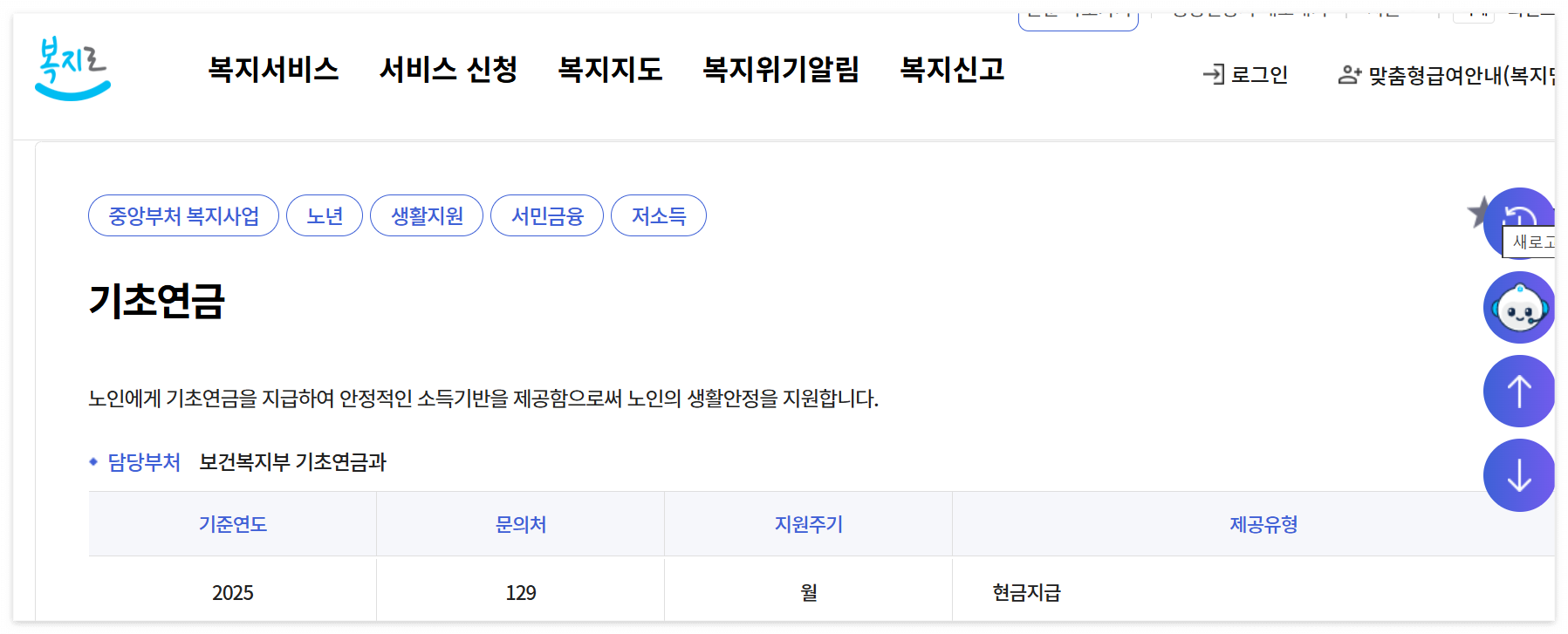 | 기초연금 | 만 65세 이상 | 월 최대 일정 금액 연금 지급 | 주민센터 방문 또는 온라인 신청 |