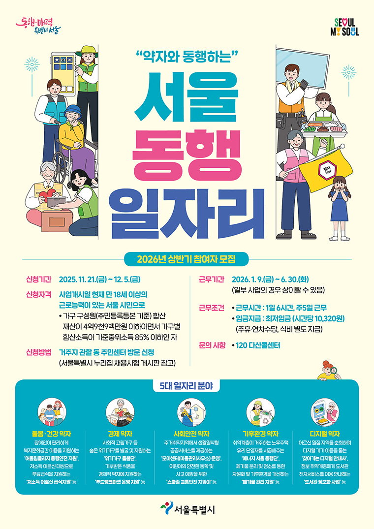 서울시가 2026년 상반기에 운영할 ‘서울 동행일자리’ 참여자를 모집하고 있습니다. 이번 사업은 단순히 일자리 제공에 그치지 않고, 취업이 어려운 시민들이 사회적 약자를 직접 돕는 활동을 통해 자존감을 회복하고 새로운 경력을 쌓을 수 있도록 설계된 공공형 일자리 프로그램입니다.
